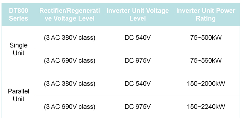تدعم سلسلة DTS800 كلاً من تكوينات محرك واحد ومحركات متعددة. كما تُمكّن وحدات عاكس متعددة من العمل بالتوازي لتشغيل محرك واحد، مما يُسهّل زيادة سعة الطاقة من خلال التشغيل المتوازي. تتوفر السلسلة بفئتين من الجهد - تيار متردد ثلاثي الطور 380 فولت و690 فولت - وتغطي نطاقًا واسعًا من الطاقة يتراوح بين 75 كيلوواط و2240 كيلوواط.