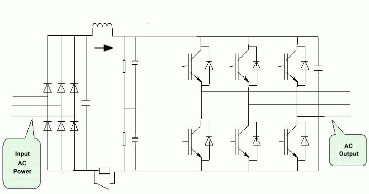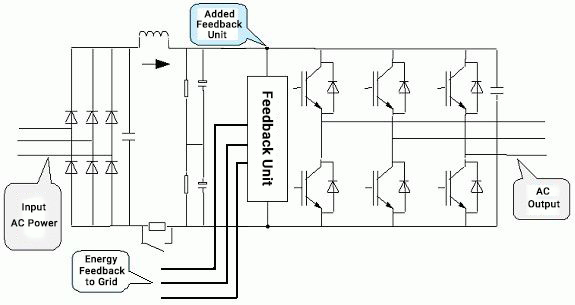 تمت إضافة وحدة تغذية راجعة متجددة إلى دائرة التيار المستمر الخاصة بمحرك التردد المتغير لإعادة تغذية الطاقة الكهربائية المتولدة أثناء حالة التجديد (توليد الطاقة) للمحرك إلى الشبكة.